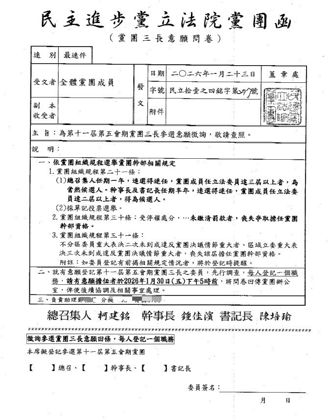 民進黨團行文各辦公室,徵詢黨團三長意願,下屆總召人選受矚。讀者提供