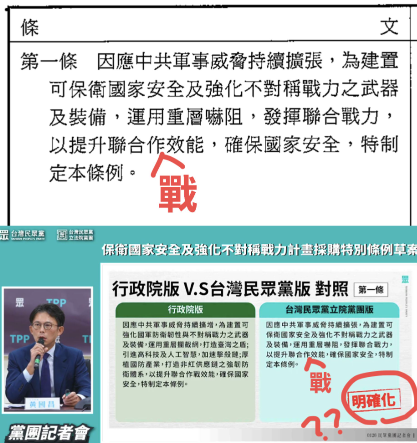 行政院提出金額高達1.25兆的「國防特別條例」,在立法院程序委員會慘遭藍白封殺,至今無法付委審查、逐條討論。民眾黨立院黨團今天(1/26)公布白營版本的軍購條例,宣稱擁有「明確化採購項目、金額、各項籌獲期程、維持成本」等5大特色。對此,民進黨發言人吳崢就發文狠酸,連第一條都有漏字,所謂明確化到底是指什麼?