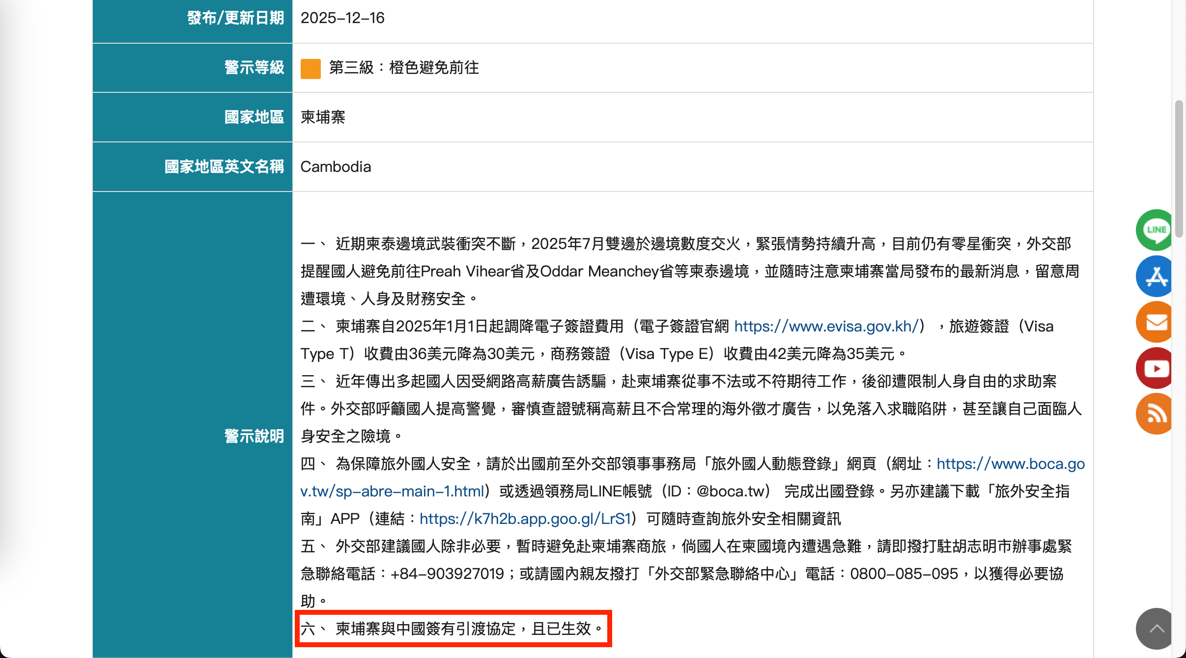 外交部領事事務局旅遊警示網頁新增是否與中國簽有「刑事司法互助條約」或「引渡條約」,供國人參考。截圖以柬埔寨為例。翻攝自領事事務局官網