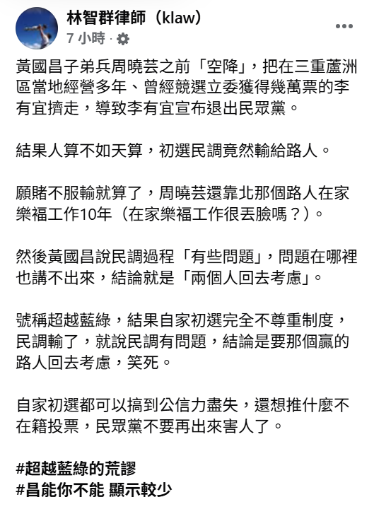 林智群諷刺,「自家初選都可以搞到公信力盡失,還想推什麼不在籍投票,民眾黨不要再出來害人了。」文末也嘲諷「超越藍綠的荒謬」、「昌能你不能」。