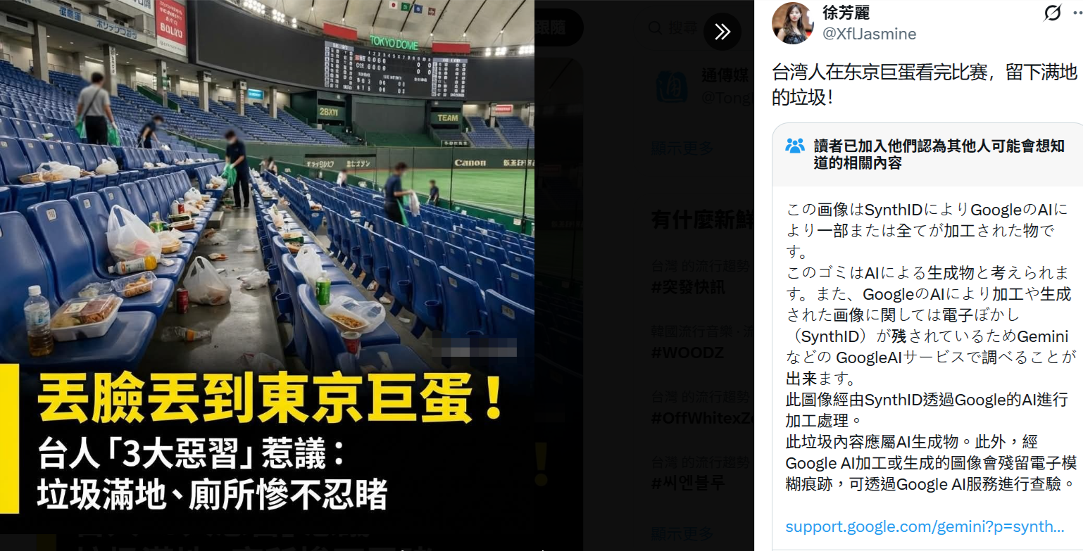 網路瘋傳「台灣人在東京巨蛋製造垃圾」的畫面,被抓包疑似是AI造假。翻攝X平台