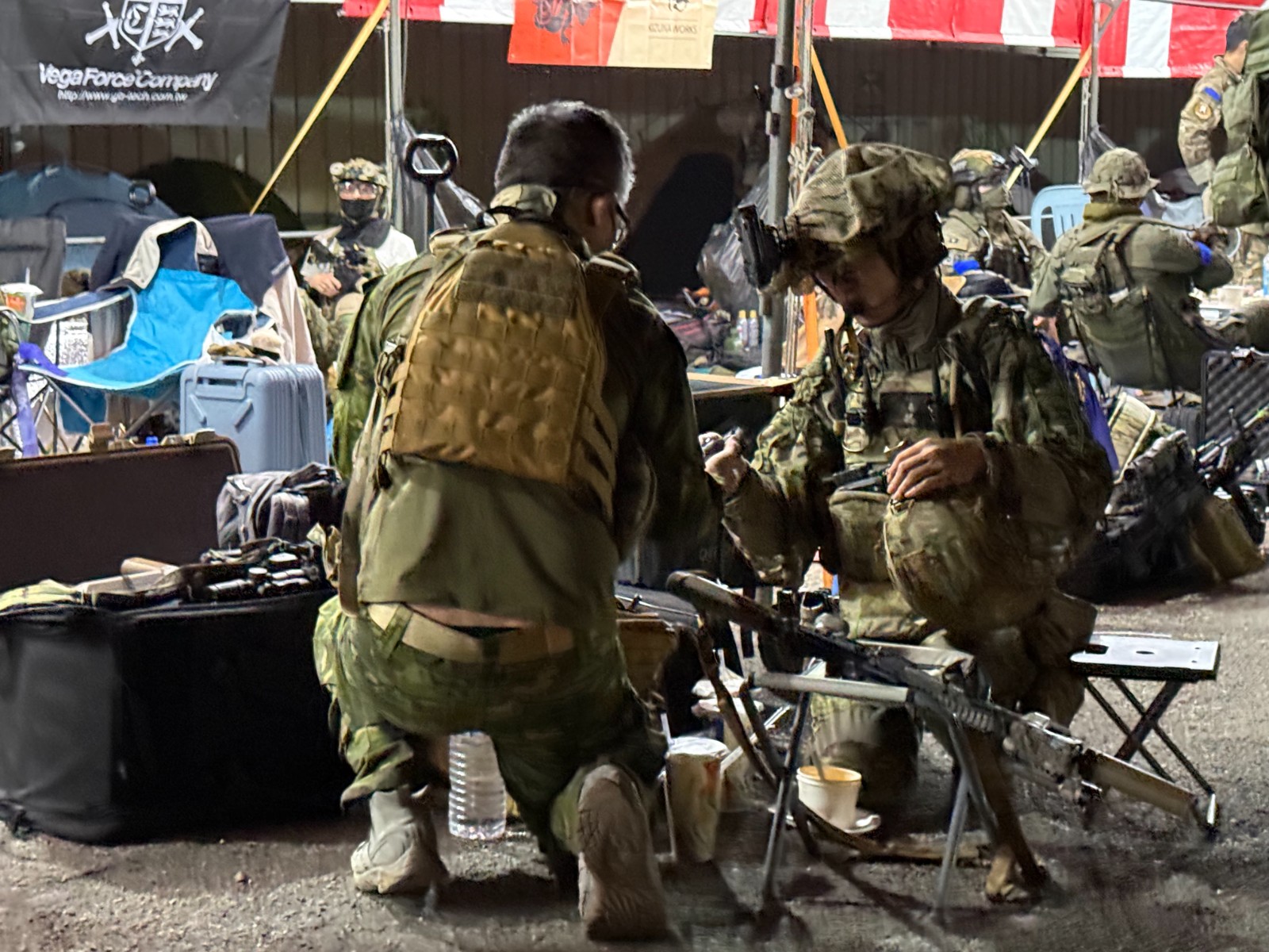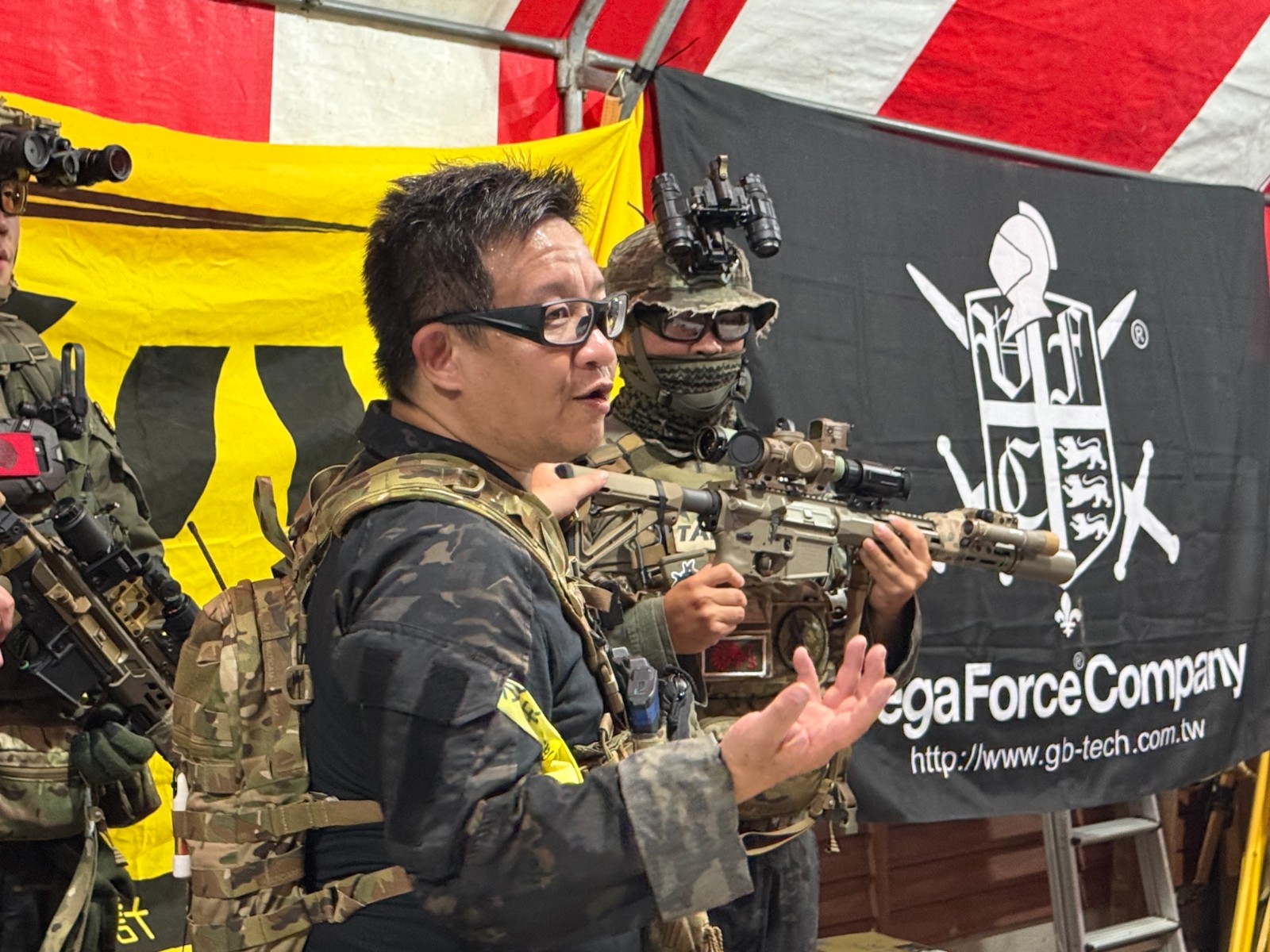 OPS隊員們也展示自己空氣軟槍(BB槍)上裝置的雷射指示器、瞄準鏡,還有更重要的夜視鏡與熱顯像系統。因為要進行夜戰,透過夜視鏡就能夠在低光度看見周遭物體與敵方人員動態,配合瞄準鏡,就能鎖定敵人動態。不過,由於敵軍可能會藉由障礙物或隱蔽物隱藏行蹤,此時,人體的溫度比周遭環境的溫度還要高,熱顯像就能以不同顏色來顯示不同溫度的人體、車輛等,更能在暗夜中判斷敵蹤。而夜視鏡與熱顯像系統,也可以裝在頭盔上,以折疊式的掛架來配合作戰情境使用。