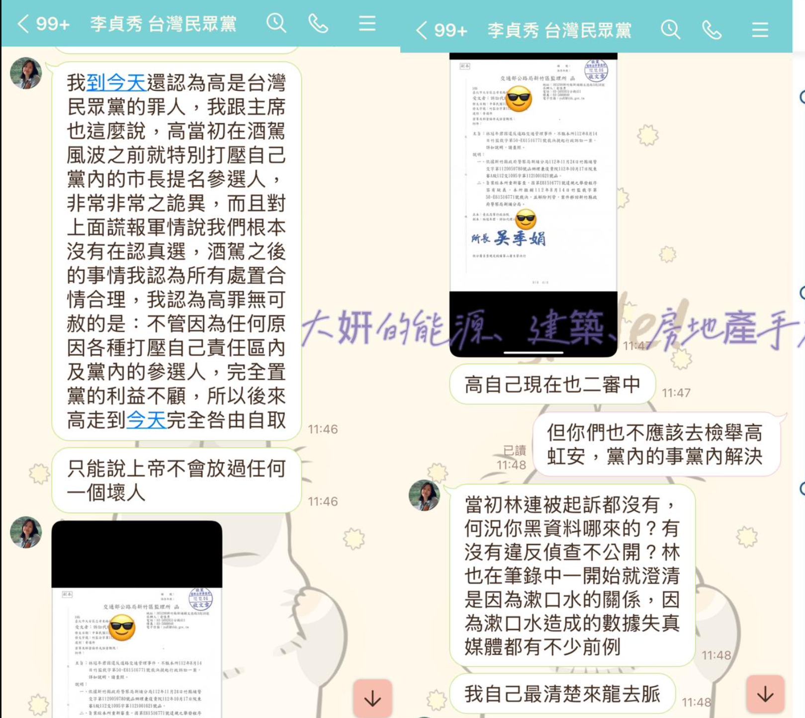 曾妍潔昨日更於臉書PO出對話紀錄截圖,其中可見李貞秀表示,「我到今天還認為高是台灣民眾黨的罪人,我跟主席也這麼說,高當初在酒駕風波之前就特別打壓自己黨內的市長提名參選人,非常非常之詭異,而且對上面謊報軍情說我們根本沒有在認真選。」