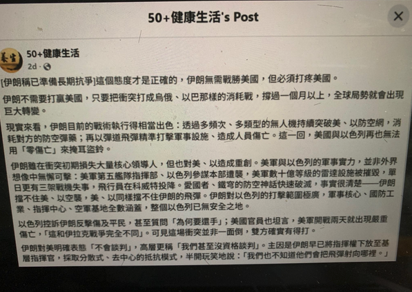 無國界記者調查部主任弗洛傑(Arnaud Froger)和自由記者蘇菲威爾斯(化名)在上周四(4/23)發表的一篇文章中提到,臉書粉絲專頁「50+ 健康人生」(編按:應為「50+健康生活」)乍看之下是針對年長讀者推送健康養生建議的粉絲頁,但今年3月,美國加入以色列對伊朗發動戰爭後,該粉專發布了一篇分析,指出德黑蘭無需在軍事上擊敗華盛頓,而是應打疼美國,立場與中國官方媒體的敘事高度一致。該貼文隨後遭到刪除,不過本次調查取得的螢幕截圖保留了該內容。