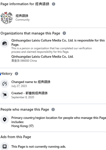 無國界記者發現,該粉絲專頁似乎與郭台銘本人並無直接關聯,它的管理者是一家叫做秦皇島萊秀文化傳媒有限公司的企業,該公司和無邊界集團共享同一個登記地址、公司網站內容也幾乎一模一樣,「經典語錄」粉絲頁很可能就在選前期間,成為傳播親中敘事的切入點。
