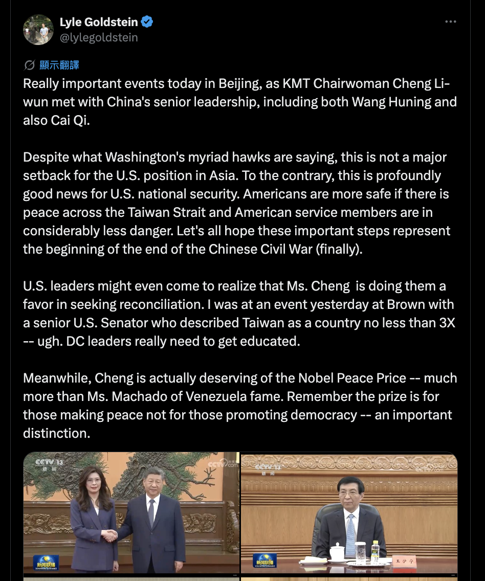 如今鄭麗文口中的「布朗大學」學者的身份也曝光,正是華府智庫「國防重點」(Defense Priorities)亞洲接觸計畫主任高德斯坦(Lyle Goldstein)。他曾在「鄭習會」後在社群平台X分享照片,強調鄭麗文與習近平會面對美國國家安全來說絕對是個好消息,「如果台海兩岸實現和平,美國人就會更加安全,美國軍人面臨的危險也會大大減少」。