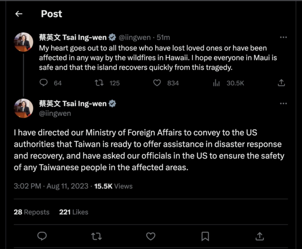 蔡英文總統2023.8.11下午推特(twitter)發文,祝福夏威夷茂宜島民眾平安,並盼望茂宜島能儘速從野火災情中復原。截自蔡英文臉書