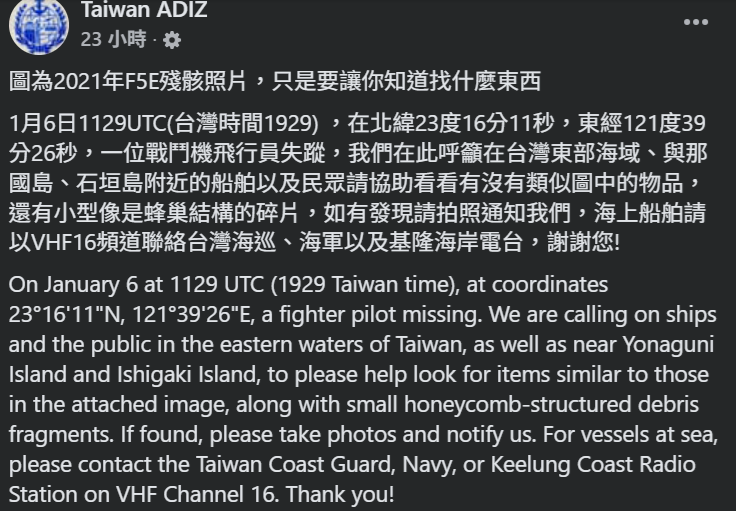 「TaiwanADIZ」發文提到,飛官失聯座標位在北緯23度16分11秒,東經121度39分26秒。粉專以2021年F-5E戰機墜海時的殘骸照片為例,提醒在台灣東部海域、與那國島、石垣島附近的船舶以及民眾協助,若發現類似形狀的金屬物品,或是有「蜂巢結構」的小型碎片,希望能拍照通報,海上船舶請以VHF16頻道聯絡台灣海巡、海軍以及基隆海岸電台;文章同步以英、日文貼出。