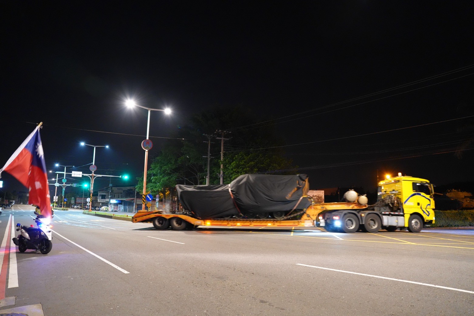 台灣向美國購買的108輛M1A2T戰車第三批28輛抵台,2026.4.27凌晨由拖板車載運至新竹湖口陸軍裝訓部。現場並有民眾揮舞國旗為國軍加油。諸葛風雲提供