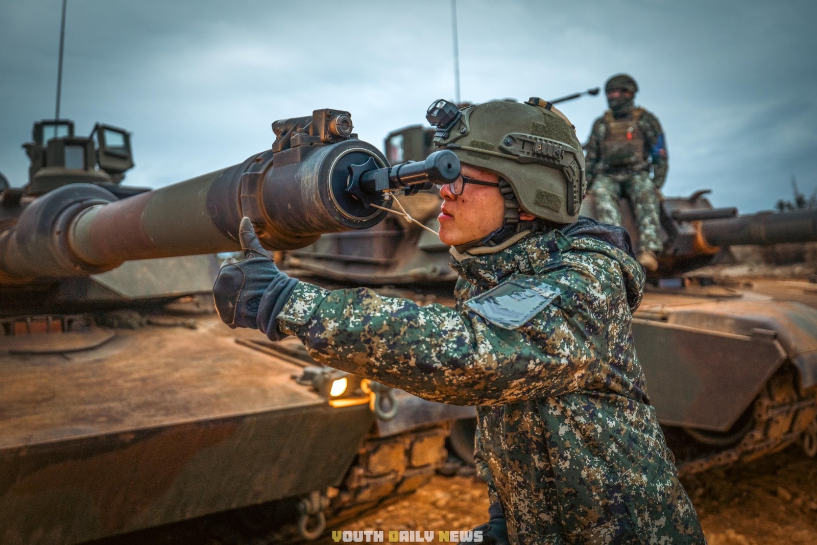 陸軍聯兵269旅聯兵3營的M1A2T「艾布蘭式」主力戰車,2025年1月於新竹坑子口靶場實施機槍戰鬥射擊鑑測,在以砲塔上的遙控武器站的機槍射擊前,檢查安裝在主砲口上射擊鑑測儀器確實裝妥。青年日報