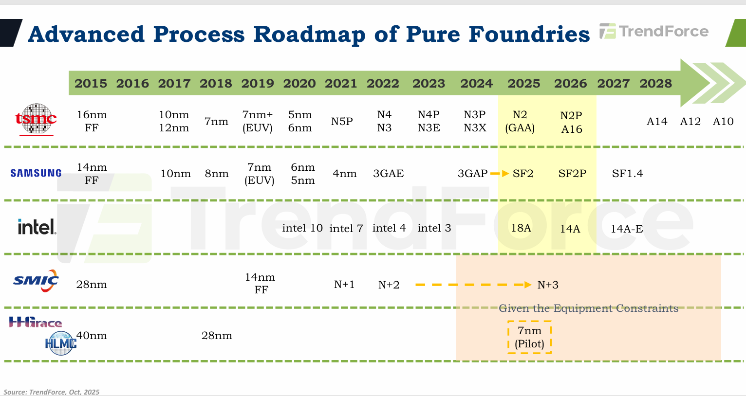 主要晶圓代工業者製程節點布局。TrendForce提供
