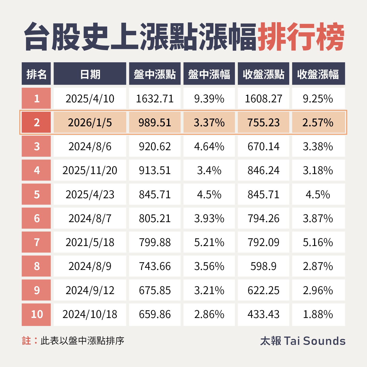美股主要指數2日收紅,台積電ADR上漲5.17%,收在319.61美元創收盤新高。台股(1/5)早盤開高走高,甫開盤即大漲逾500點,在台積電強勢領盤下,加權指數盤中最高漲989.51點至30339.32點,收盤漲勢略收,漲了755.23點,以30105.04點作收,漲幅2.57%,成為台股史上首度衝破3萬點大關的一天。指數同步刷新盤中、收盤新高,也創下史上第2大單日盤中漲點紀錄。
