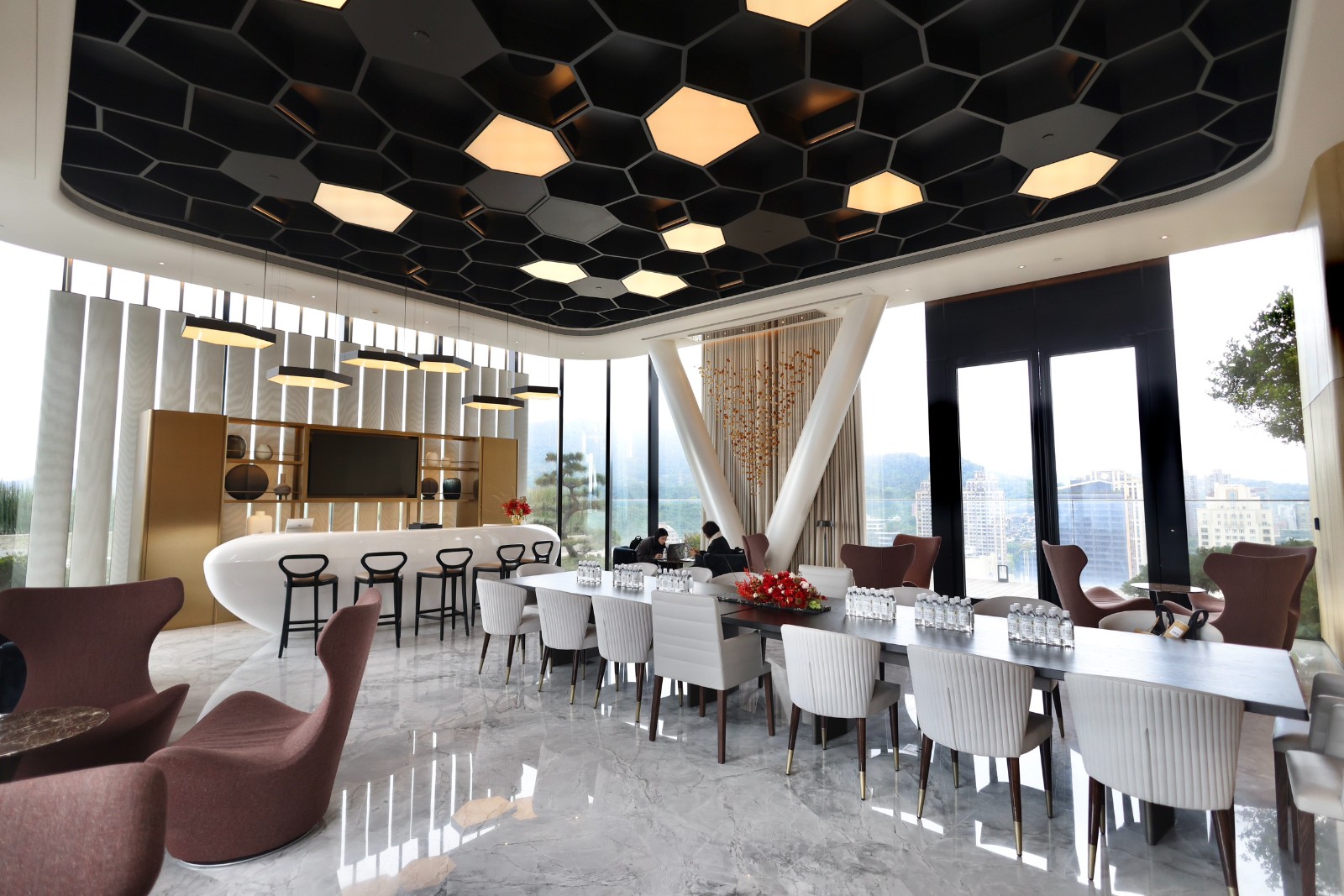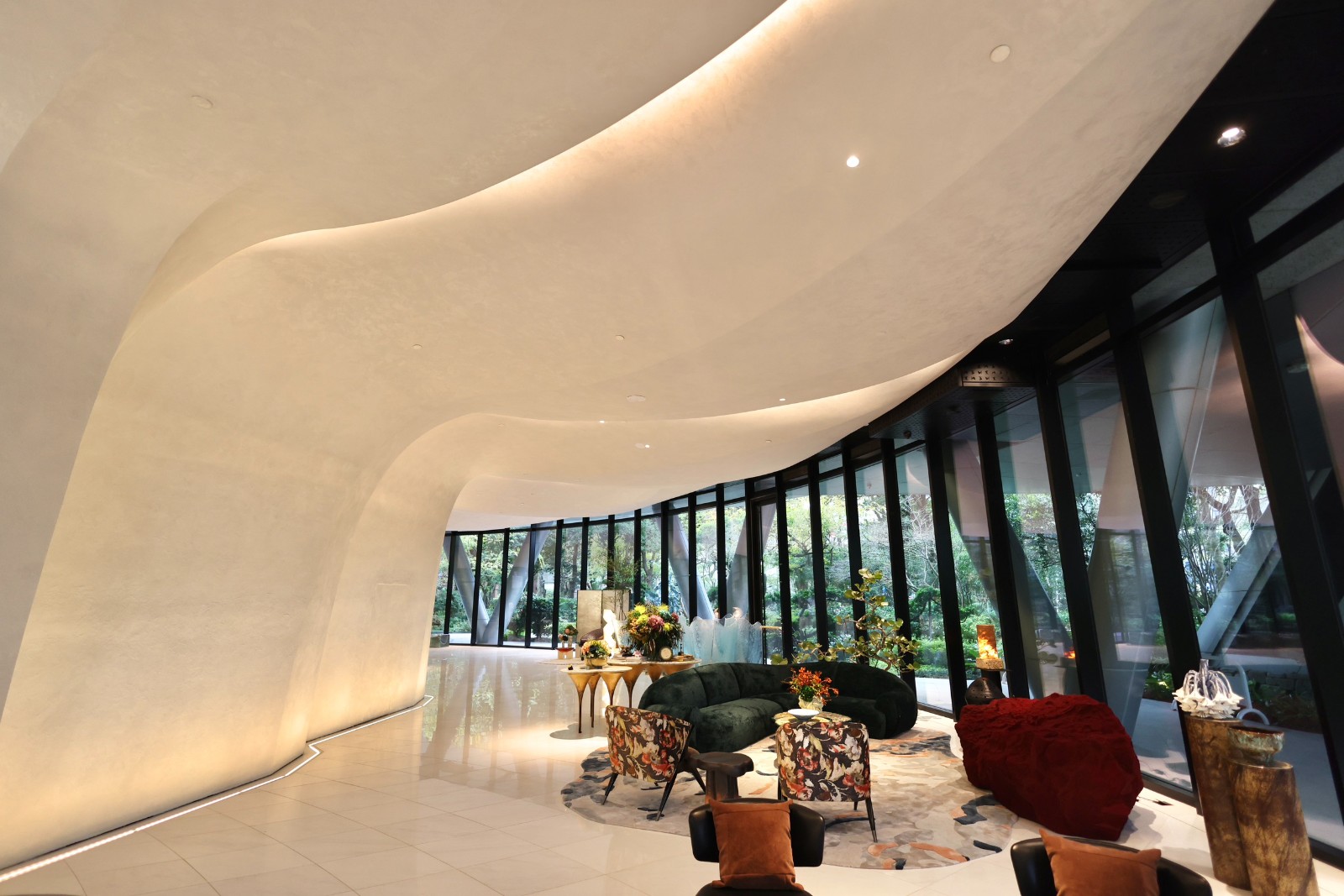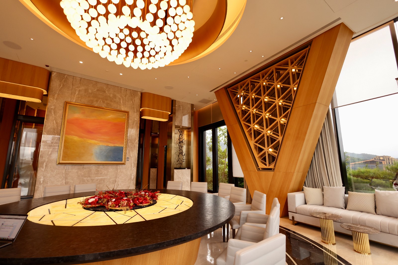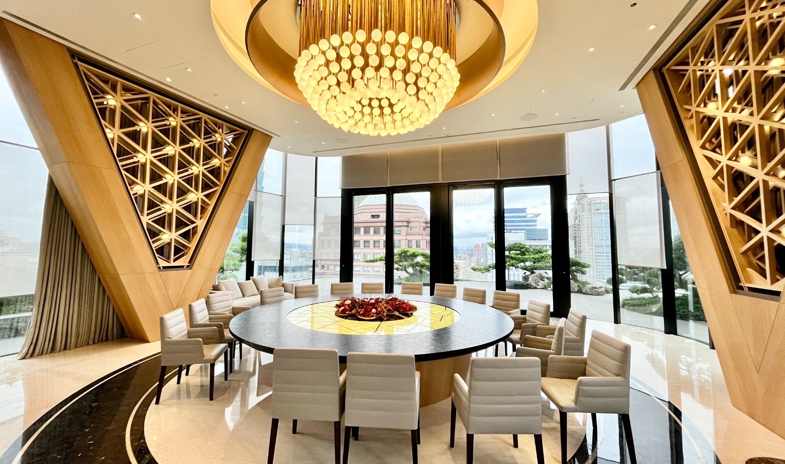 陶朱隱園設計一樓約300坪、挑高六米的迎賓大廳,規劃為360度全圓開放式空間,將室內與戶外景觀無縫銜接。李政龍攝
