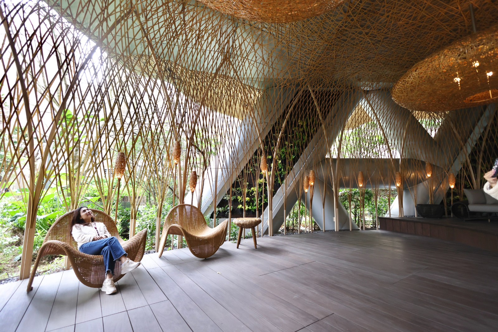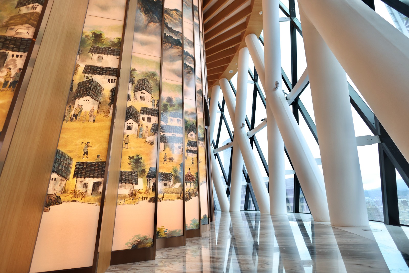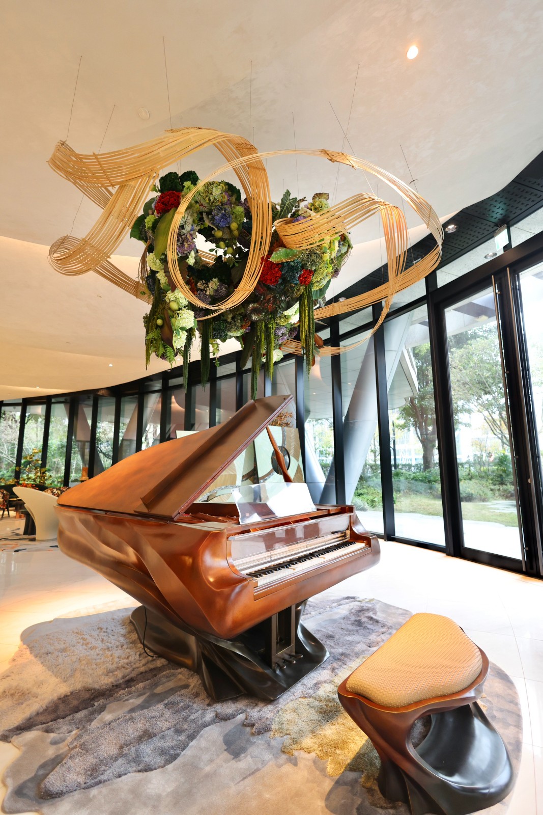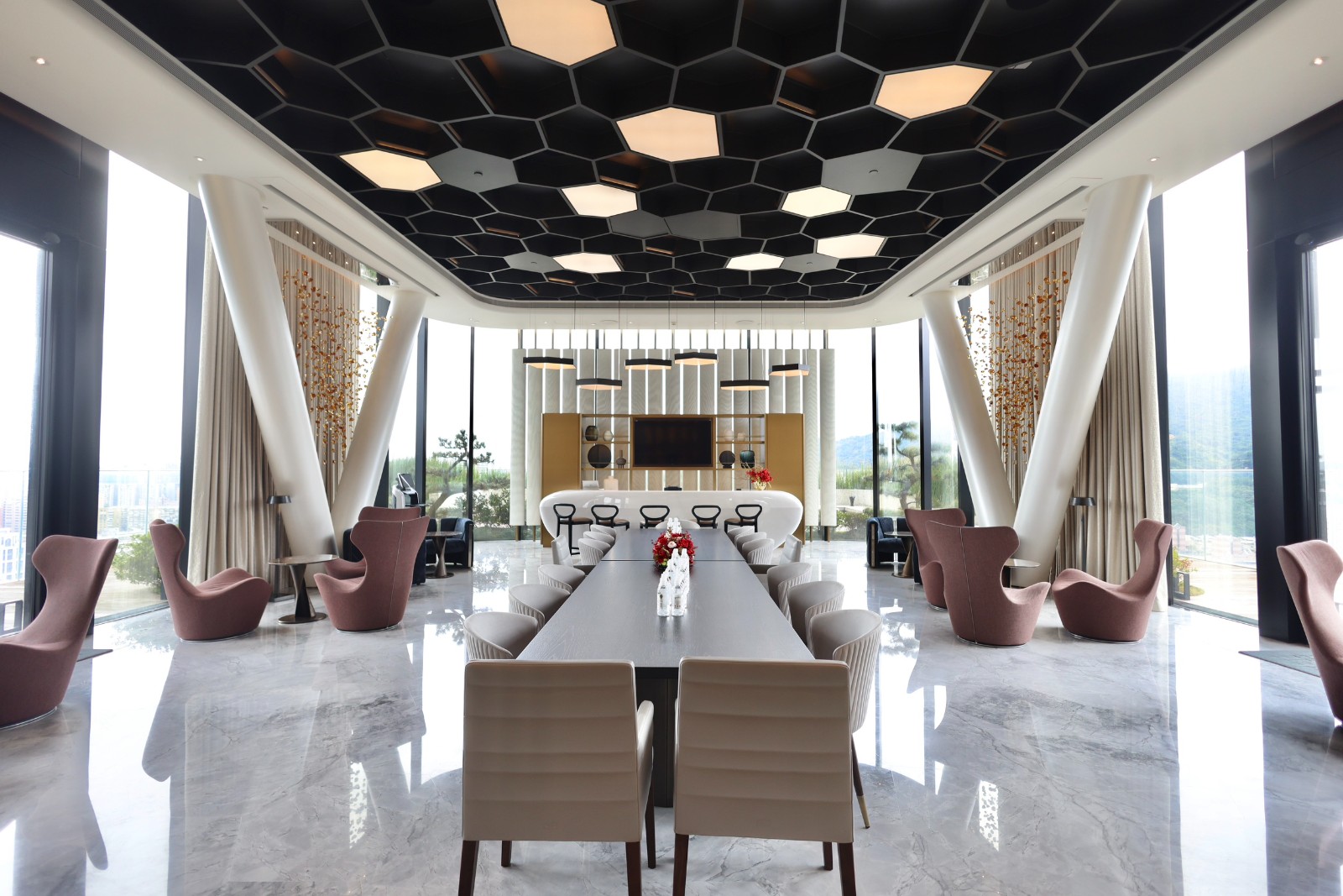 陶朱隱園設計一樓約300坪、挑高六米的迎賓大廳,規劃為360度全圓開放式空間,將室內與戶外景觀無縫銜接。李政龍攝