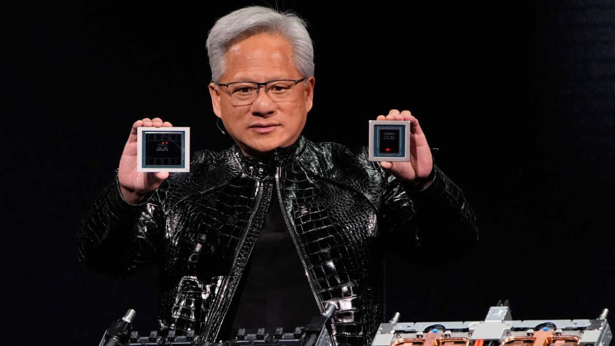 經濟部今天准予輝達增資台灣33億元,認購台灣輝達經典股份有限公司增資股份。 圖為輝達執行長黃仁勳在CES展示Rubin GPU及Vera CPU。美聯社
