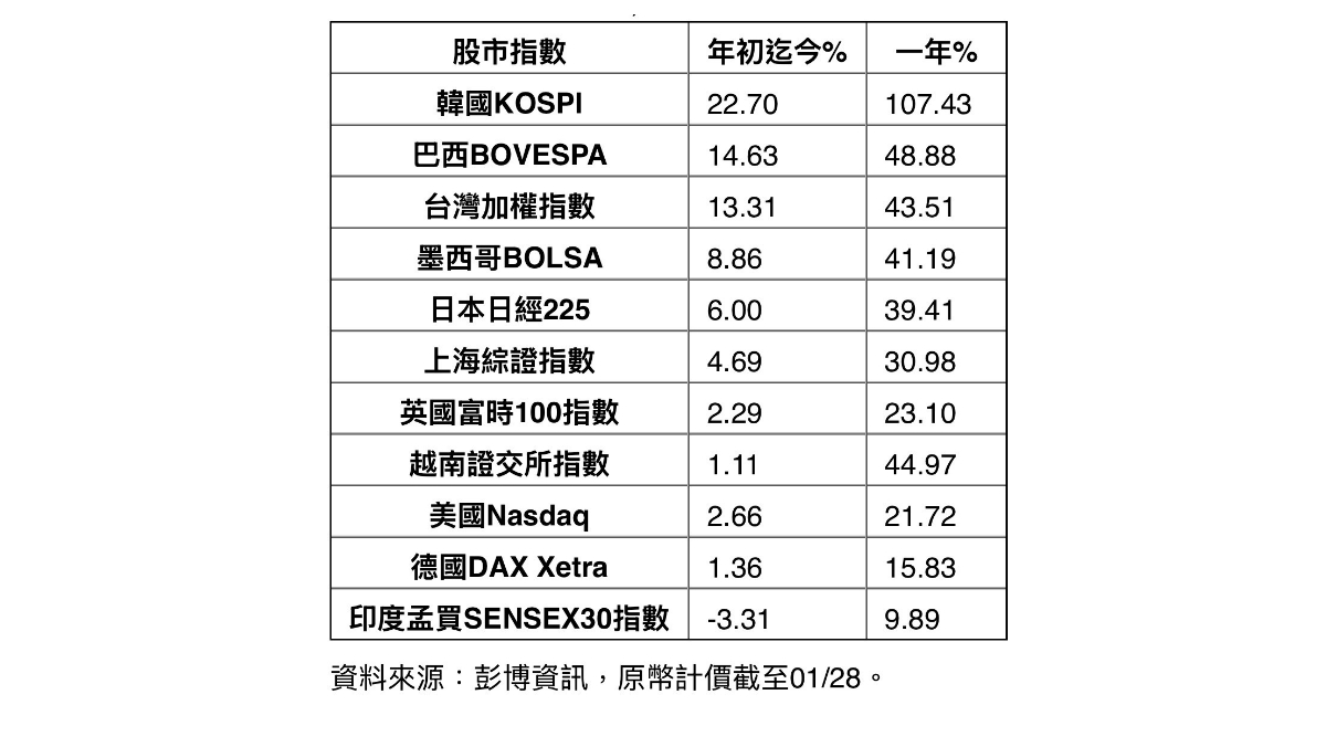 美元匯價走弱、AI創新題材大爆發,推動資金轉進新興市場,令新興股債資產成為全球投資焦點,2026年以來僅不到一個月時間,包含亞洲市場的南韓、台灣與拉美市場的巴西股市原幣計價漲幅均已超越一成,並同步創歷史新高價位。其中以南韓市場表現最為優異,KOSPI指數漲幅22.7%,FTSE富時南韓指數漲幅更高達26.08%,過去一年漲幅128.38%,主要反應AI基礎建設對於HBM高頻寬記憶體等先進記憶體供不應求拉抬價格與出貨。