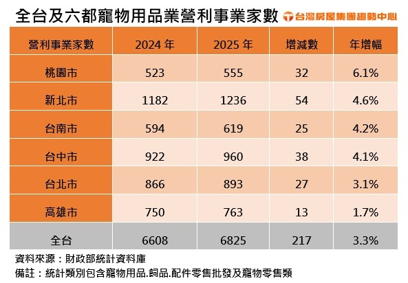 台灣房屋集團分析,新北市總家數達1236家,位居六都之冠,也是唯一家數破千的城市;而成長最多的則是桃園市,2025年寵物用品相關營利事業家數來到555家,年成長率6.1%,為六都中寵物經濟成長最快的城市。