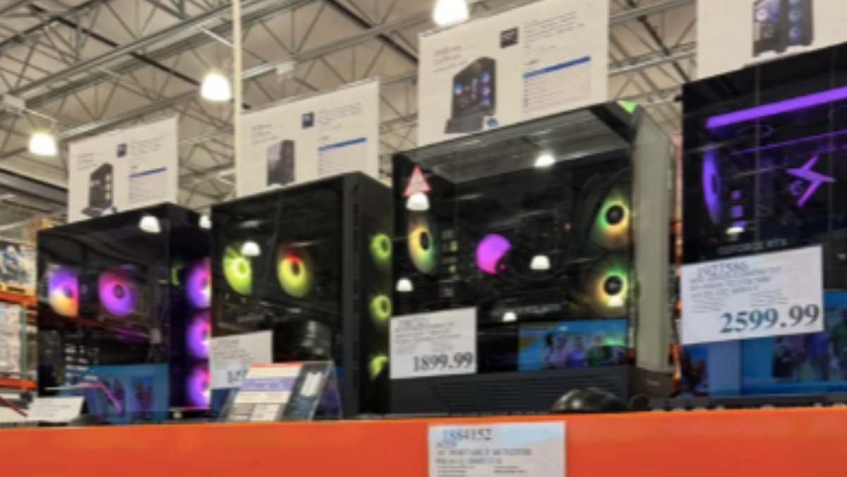 網友在Reddit論壇分享照片,好市多賣場貨架上多部在售的電腦機箱通電運作,但主機板記憶體模組卻全面拆除,部分型號連顯示卡都沒裝,僅空機陳列,以防範失竊風險。