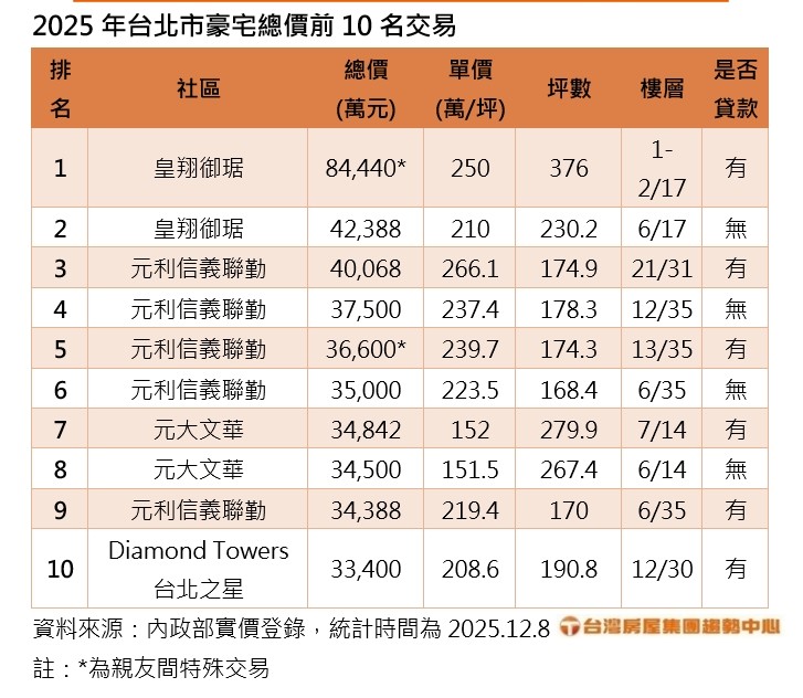 台北市前10名的豪宅交易中,有4筆是採無貸款交易。台灣房屋提供