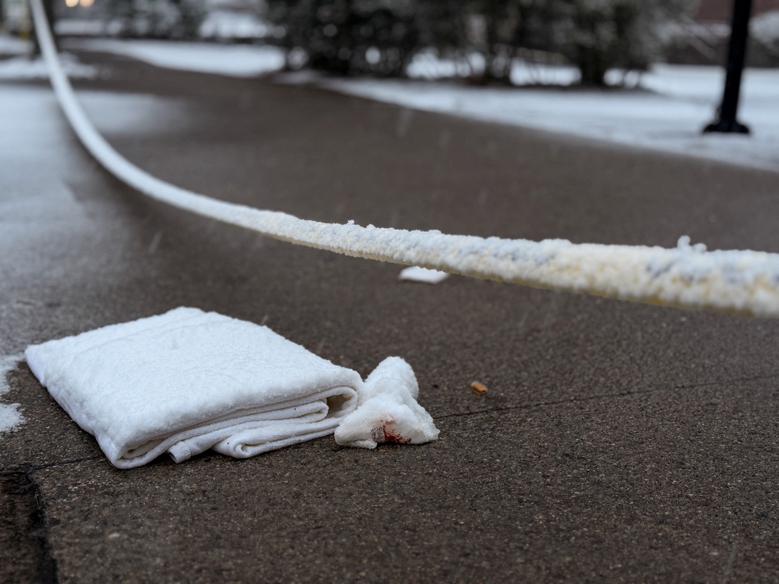 2025年12月14日,布朗大學前一天(12/13)發生槍案的現場,仍可見沾血的紗布與毛巾。路透社
