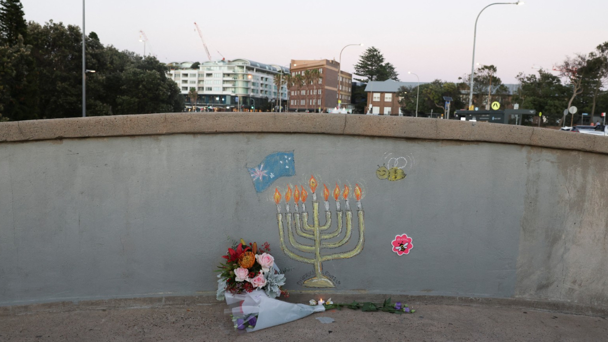 澳洲雪梨邦迪海灘恐攻案發生後,民眾在槍手獵殺人群的天橋尚擺放鮮花並畫上光明節點燈圖示哀悼。路透社