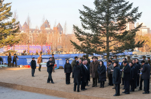 2026年1月6日,北韓領導人金正恩參觀海外軍事作戰功勳紀念館的建築工地,女兒金朱愛、妻子李雪主,以及政府幹部們在旁陪同。路透社