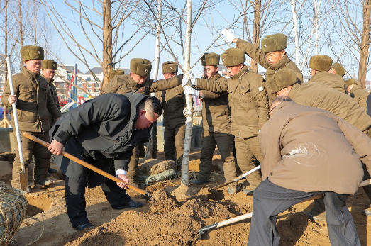 從北韓釋出的畫面可以看到,金正恩親自操作堆高機,參與現場作業,並在植樹儀式過程,拿起鏟子挖土。