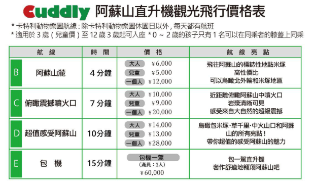 這次失聯的旅客搭乘的是阿蘇卡德利樂園遊程,從動物園出發巡航草千里及阿蘇中岳,約10分鐘,成人每名費用1萬4000日幣(約2800元台幣)。