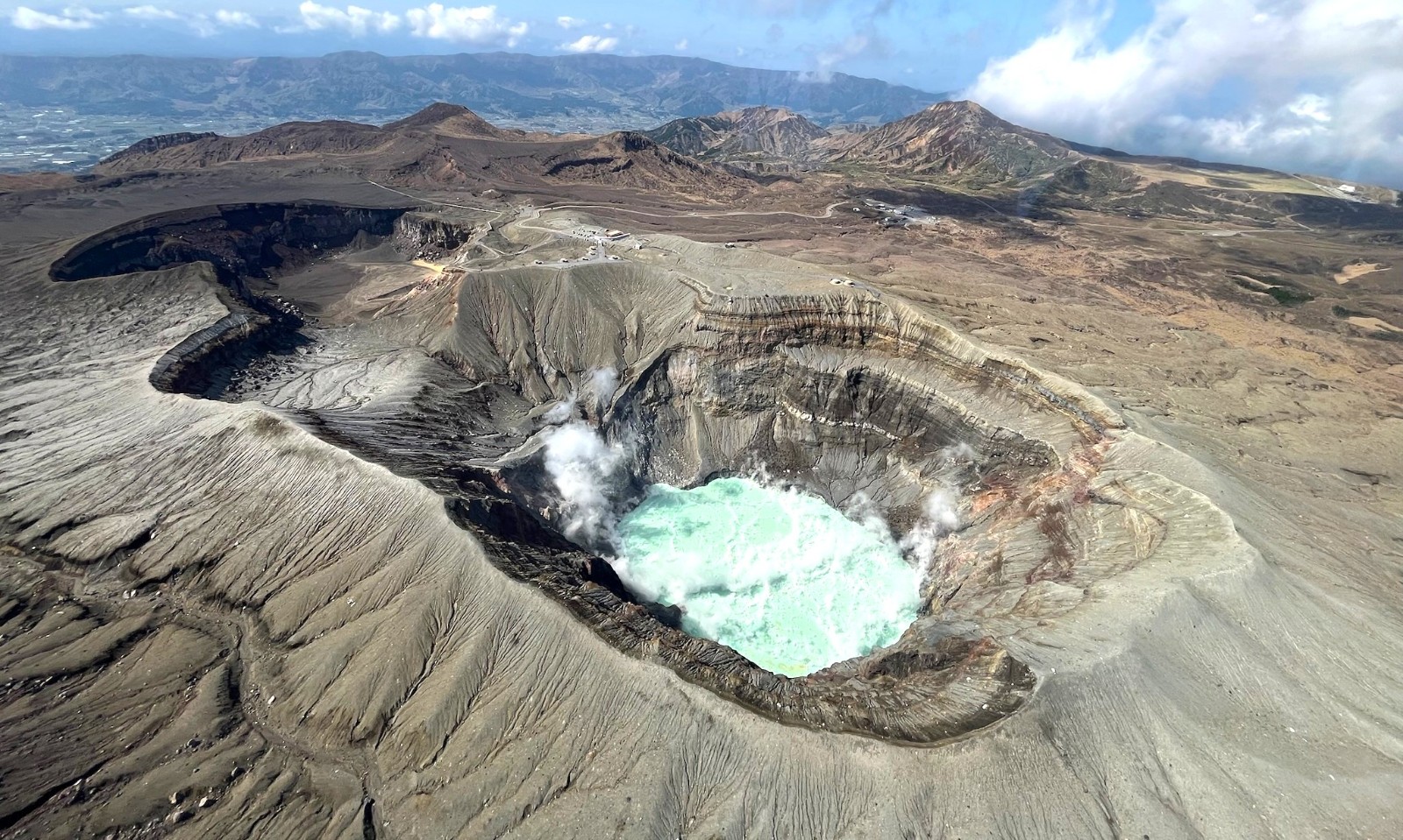 阿蘇火山是熊本的熱門景點,當地除了可以漫步於廣闊的「草千里」,也能搭乘直升機俯看壯麗景致,包括火山口、米塚、草千里等。