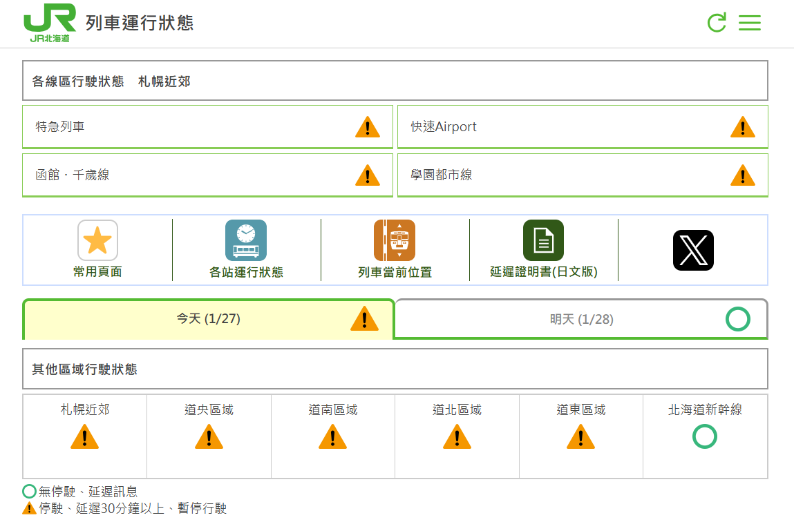 旅遊達人943接受《中央社》訪問時建議,旅客目前最重要的是確保自身安全,也要掌握即時資訊,譬如交通資訊可直接到JR北海道官網查,看到「運転見合わせ」即是停駛;班機可上新千歲機場官網,巴士則是到北海道中央巴士官網,千萬別只依賴Google Maps做應變計畫。