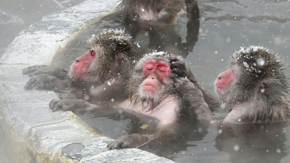 2026年1月14日,日本北海道函館的函館熱帶植物園中,日本猴在雪地泡溫泉。Kyodo News /美聯社
