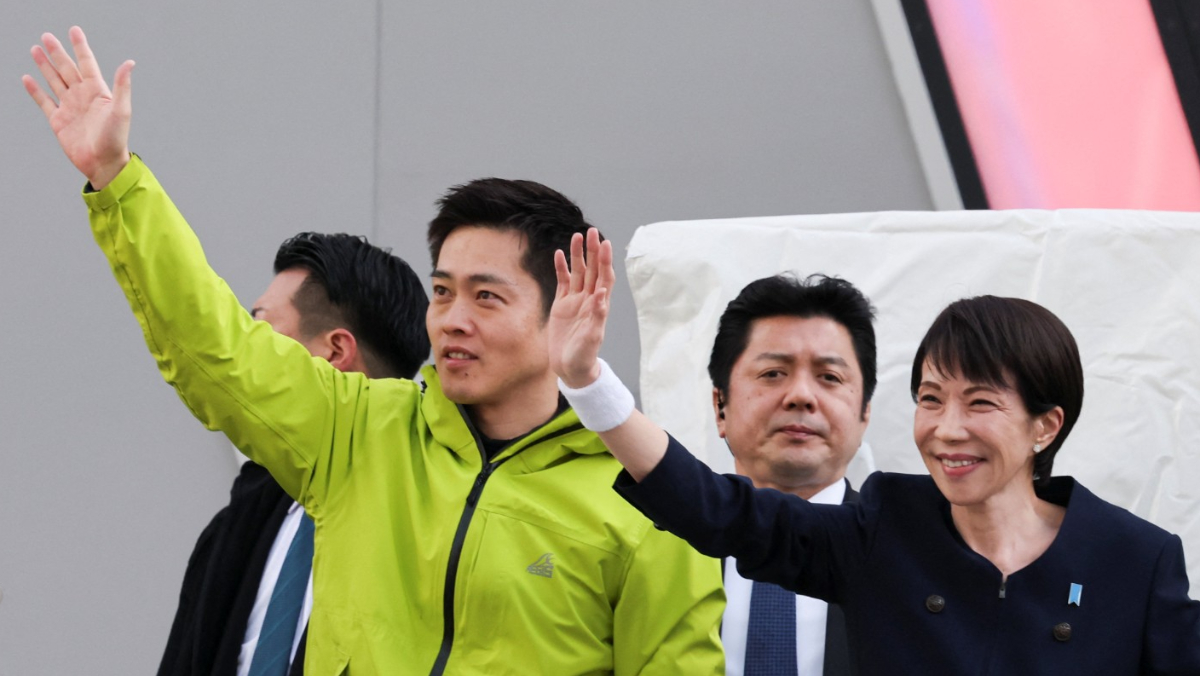 2026年1月27日,日本眾議院公告提前改選,自民黨總裁、首相高市早苗偕日本維新會代表吉村洋文在東京街頭發表演說。路透社