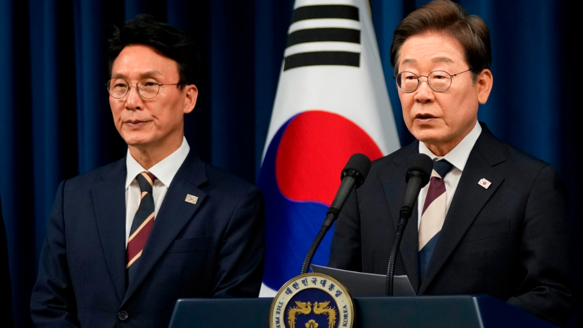 2025年6月4日,李在明上任南韓總統首日宣布首波內閣名單,圖為獲任國務總理的金民錫(左起)、李在明。美聯社