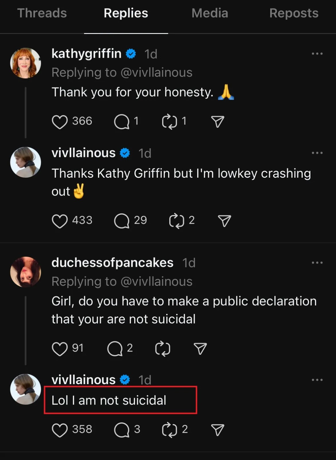 薇薇安指出,雖然她也是透過司法部文件才得知這些電郵存在,但她清楚記得9歲那年,全家確實曾在特定時間點前往「蘿莉島」度假,並表示她對童年時期在那一帶搭船的黑暗海面印象深刻,「我和各位一樣都是慢慢才了解狀況。假如還有任何其他能證實的消息,之後我也會出面。」薇薇安後續也接受網友建議,澄清自己「並沒有自殺傾向」。