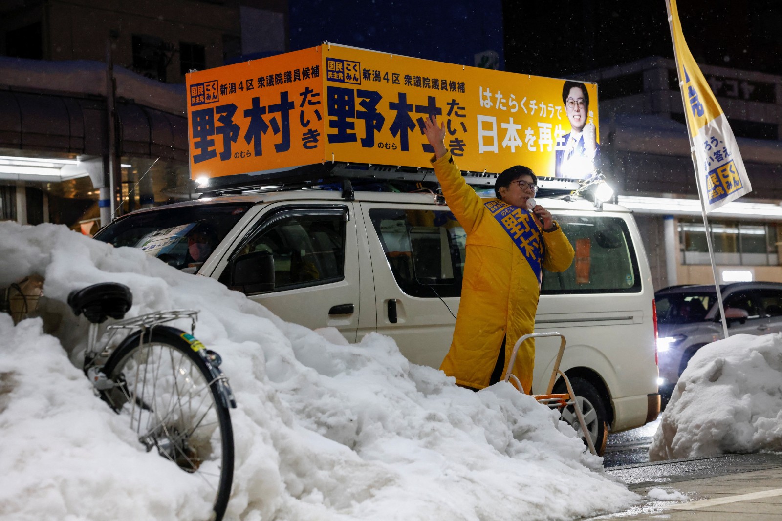 日本將於2月8日舉行眾議院改選投票,新潟縣的國民民主黨候選人野村泰暉,2月7日在長岡市的積雪街道旁演說。路透社