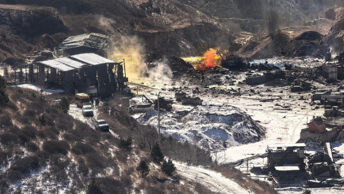 中國山西省山陰縣一間生物科技公司發生爆炸,現場冒出暗黃色煙霧。翻攝央視新聞