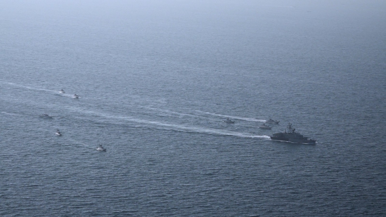 伊朗官媒所提供,伊朗革命衛隊船隻2月16日在荷莫茲海峽進行演習的畫面。美聯社