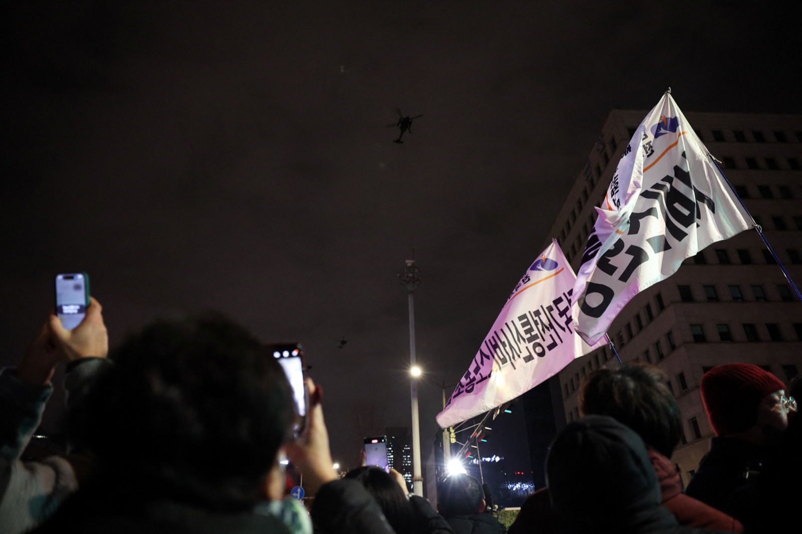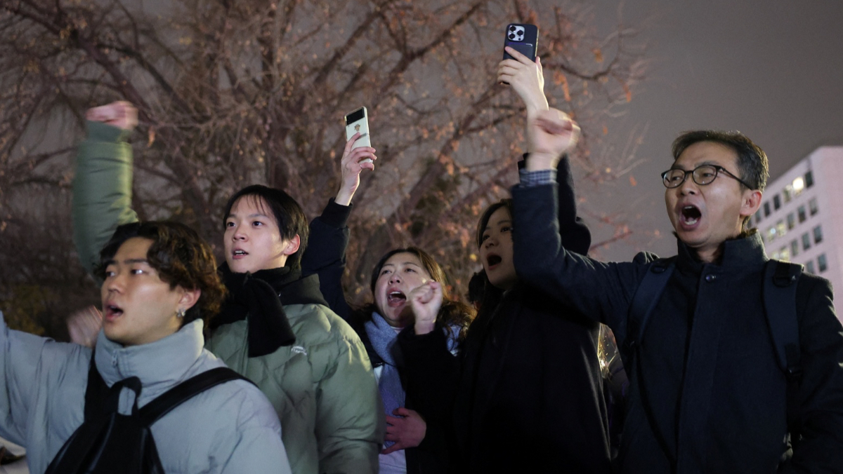 2024年12月4日,南韓民眾聚集在國會前徹夜抗議總統尹錫悅宣布戒嚴。路透社