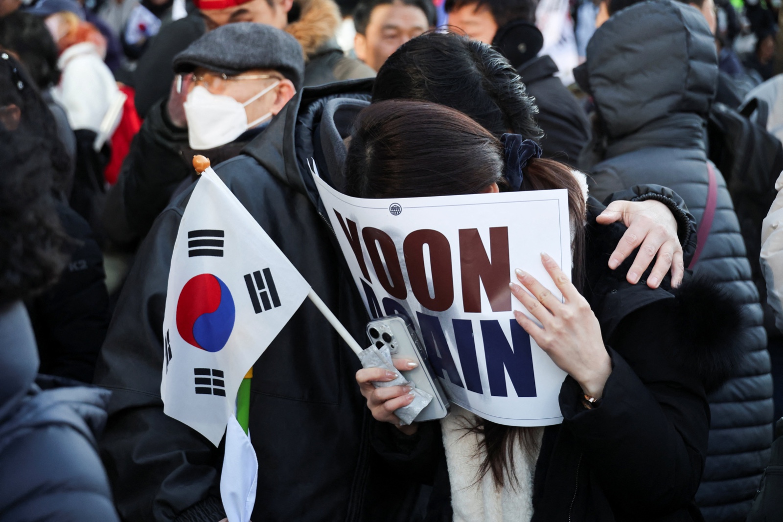 2026年2月19日,南韓前總統尹錫悅的支持者,聚集在首爾中央地方法院外等候判決出爐;得知他罪名成立後神情哀戚。路透社