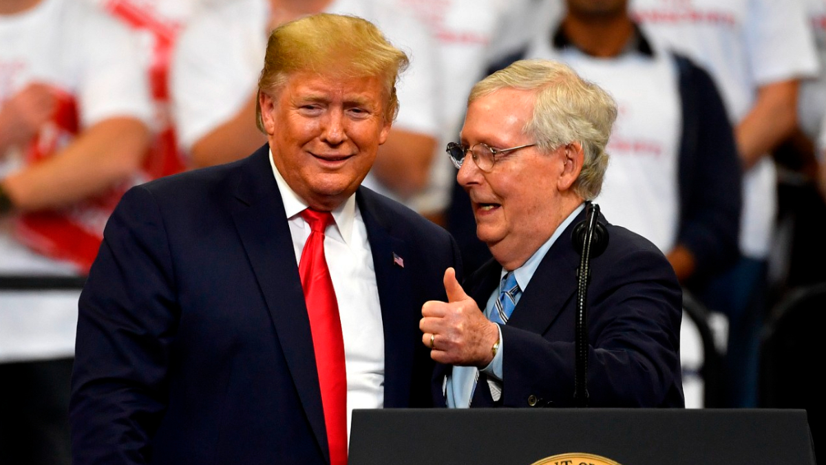 共和黨大老麥康奈反對退出北約。圖為他2019年在選區肯塔基州的競選集會中與時任總統川普同台。美聯社