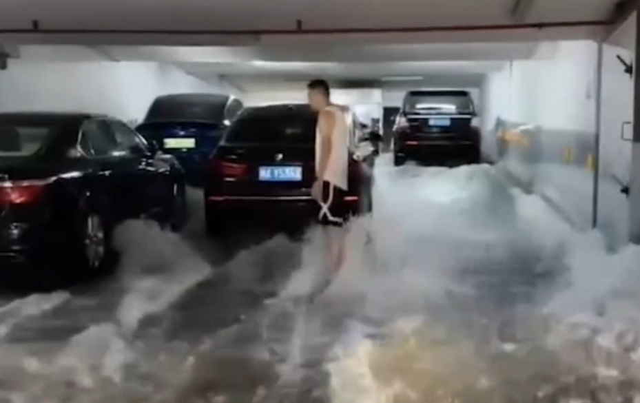 海葵颱風為福州市帶來豪大雨,多處道路變成湍急河流,地下停車場也變成水庫。翻攝百度