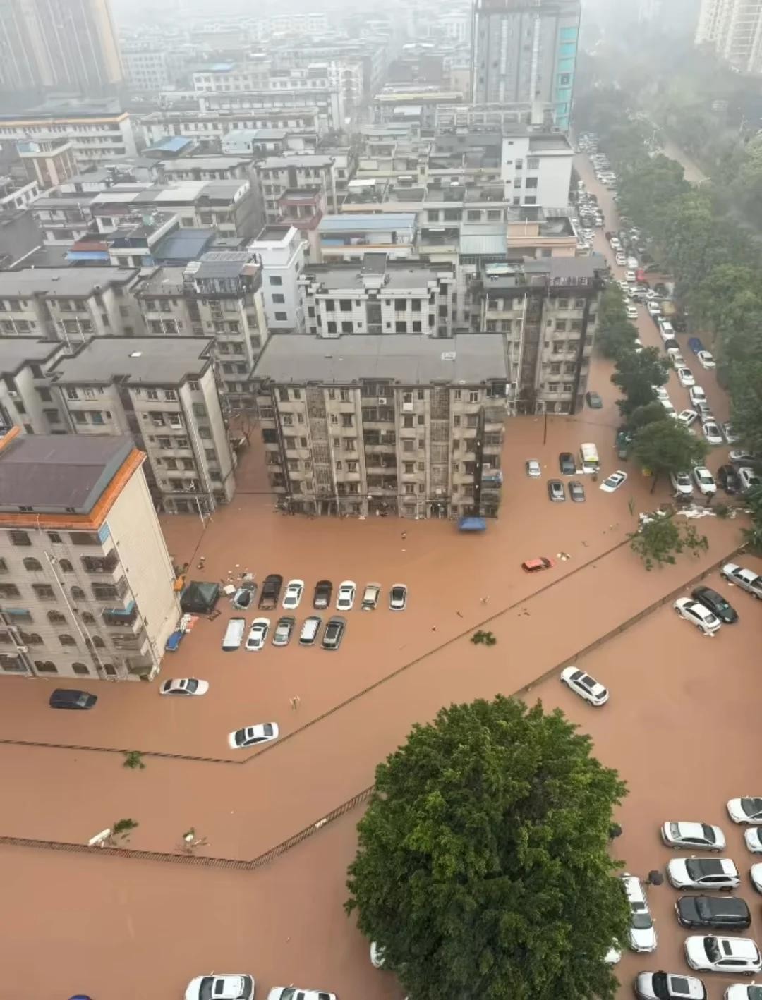 根據網路上流傳的畫面顯示,洶湧的泥水迅速淹沒道路,多輛轎車、大貨車全部泡水,甚至不少車子直接「滅頂」。人們冒險涉水,推著拋錨的車輛在深及腰部的水中緩步前進。店面位在一樓的店家與住戶損失慘重,地下停車場更是淪為水池。