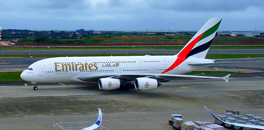 開戰後首架阿聯酋飛機航班4日從杜拜起飛,並已於稍早抵達桃園機場第二航廈。翻攝自youtube桃園機場跑道直播