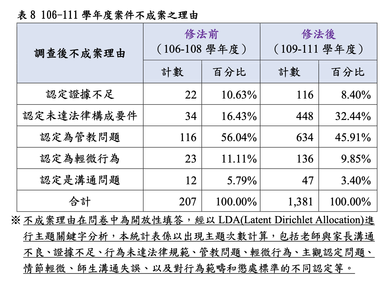 不成案多因「被認定為管教問題」 專家:過度限縮解釋霸凌報告顯示,修法前不成案原因,以被認定為「認定為管教問題 」最大宗佔56.04% ,其次為認定未達法律構成要件,佔16.43%;修法後不成案理由同樣為「認定為管教問題 」,佔45.91%,「認定未達法律構成要件」居次,佔32.44%。