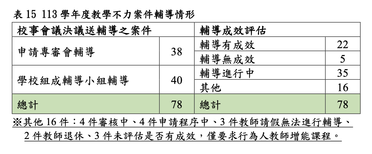 78教師遭判「教學不力」需輔導 報告指輔導機制待加強懲處之外,對於行為人的後續輔導措施又是如何?報告也顯示,2024年4月《教師解聘辦法》修法後,僅針對涉及《教師法》第16條第1項第1款「教學不力或不能勝任工作有具體事實」者進行輔導,113學年度的資料顯示,進入輔導案件共78件,35件仍在進行中,11件程序未完成。