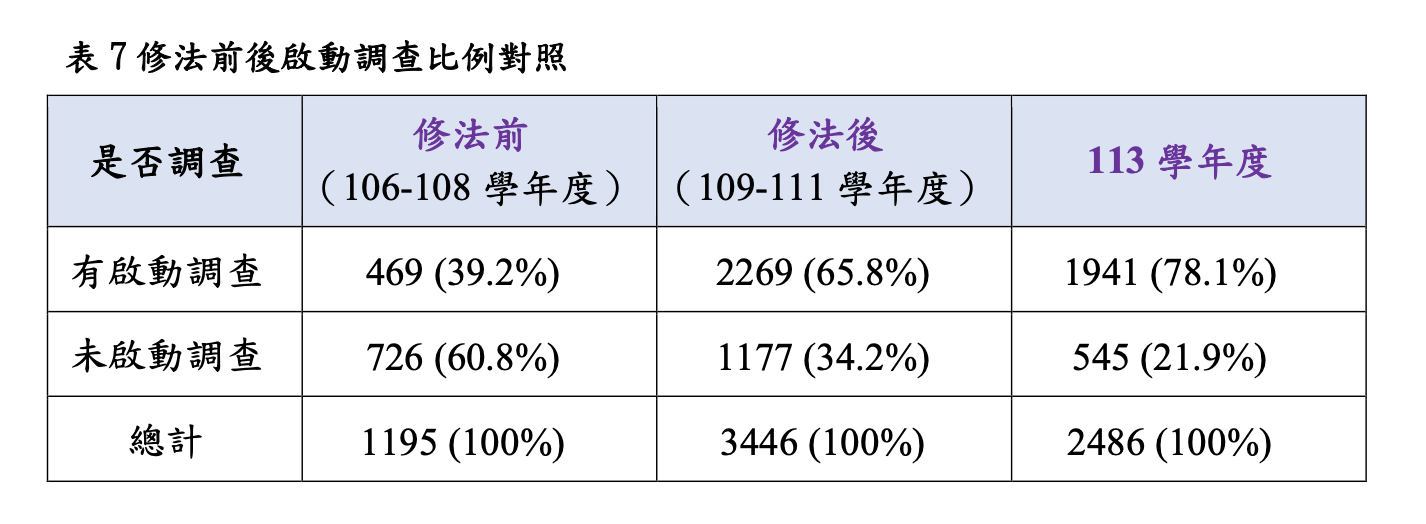 對於調查階段,報告中則指出,修法的前106-108學年度,調查後不成案比率為 32.27%,共152案;修法後的109-111學年度不成案率為50.00%,共1125案。