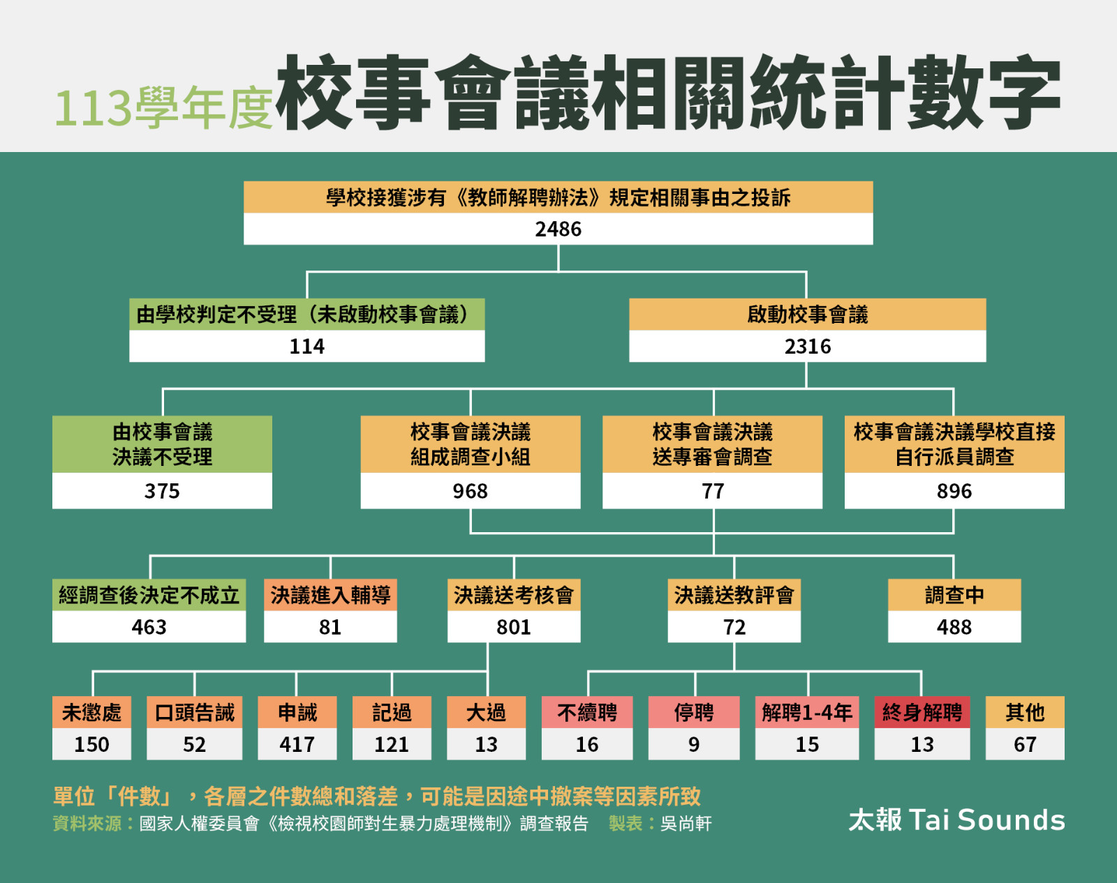 113新制一年2486案投訴 801案考核懲處、72涉身分變動2024年4月《教師解聘辦法》修正後,引來教師團體更大力道抗議家長濫訴、動輒召開校事會議,實際狀況又是如何?根據人權會所調查資料,113學年全國學校接獲涉有《教師解聘辦法》規定相關事由之投訴共有2486案,其中114案由學校判定不受理,未召開校事會議,2316案則進入校事會議。