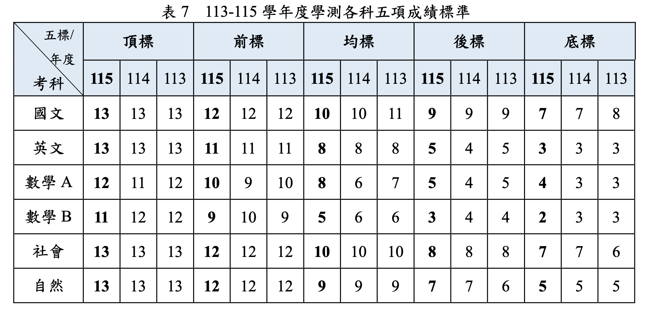 115學測各科歷年五標比較。大考中心提供