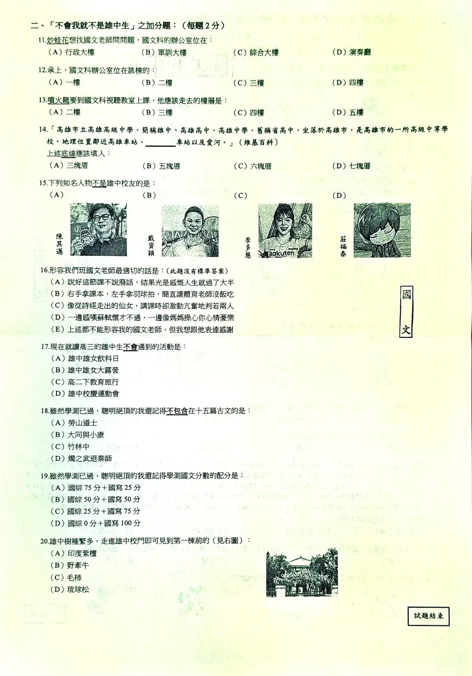 國文科考卷也藏彩蛋,其中一題考題要學生分辨下列知名人物不是雄中校友的是A陳其邁B戴資穎C李多慧D雄中校長,學生一眼看出就是李多慧,不過也有考生說,現在才知道戴資穎竟是雄中校友。
