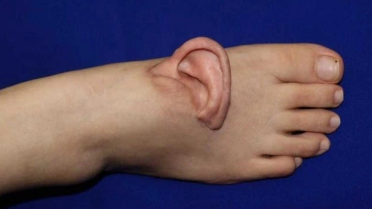 中國醫療團隊將女子耳朵「寄養」在腳背長達5個月,再以顯微重建技術移回原位。翻攝微博